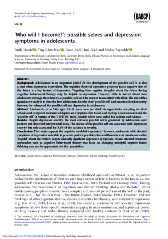 | Uncontrolled Keywords | Cognitive behavioural therapy, Possible selves, Adolescents, Depression, Future thinking |