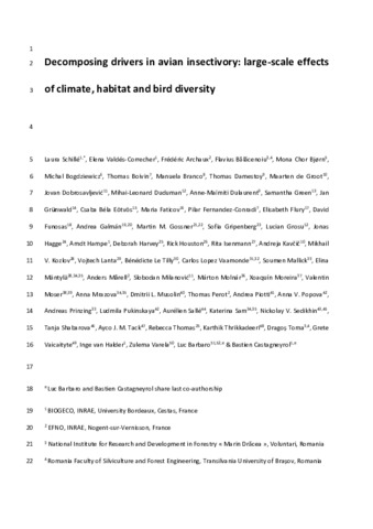Schillé, L. orcid id iconORCID: https://orcid.org/0000-0002-9907-0804, Valdés‐Correcher, E. orcid id iconORCID: https://orcid.org/0000-0001-6842-1280, Archaux, F. orcid id iconORCID: https://orcid.org/0000-0002-9996-0006, Bălăcenoiu, F. orcid id iconORCID: https://orcid.org/0000-0002-9818-1086, Bjørn, M. C. orcid id iconORCID: https://orcid.org/0000-0002-2748-4231, Bogdziewicz, M. orcid id iconORCID: https://orcid.org/0000-0002-6777-9034, Boivin, T. orcid id iconORCID: https://orcid.org/0000-0003-1694-2425, Branco, M. orcid id iconORCID: https://orcid.org/0000-0002-8140-1257, Damestoy, T. orcid id iconORCID: https://orcid.org/0000-0001-5802-5137, de Groot, M. orcid id iconORCID: https://orcid.org/0000-0002-5721-6676, Dobrosavljević, J. orcid id iconORCID: https://orcid.org/0000-0002-6155-5654, Duduman, M.‐L. orcid id iconORCID: https://orcid.org/0000-0001-7732-3738, Dulaurent, A.‐M. orcid id iconORCID: https://orcid.org/0000-0003-1910-5817, Green, S. orcid id iconORCID: https://orcid.org/0000-0001-7789-0783, Grünwald, J. orcid id iconORCID: https://orcid.org/0000-0003-0336-8647, Eötvös, C. B. orcid id iconORCID: https://orcid.org/0000-0001-5534-4597, Faticov, M. orcid id iconORCID: https://orcid.org/0000-0001-8206-9332, Fernandez‐Conradi, P. orcid id iconORCID: https://orcid.org/0000-0001-7025-2623, Flury, E., Funosas, D. orcid id iconORCID: https://orcid.org/0000-0001-9964-1120, Galmán, A. orcid id iconORCID: https://orcid.org/0000-0001-6344-7721, Gossner, M. M. orcid id iconORCID: https://orcid.org/0000-0003-1516-6364, Gripenberg, S. orcid id iconORCID: https://orcid.org/0000-0002-8788-2258, Grosu, L., Hagge, J. orcid id iconORCID: https://orcid.org/0000-0001-8938-6680, Hampe, A. orcid id iconORCID: https://orcid.org/0000-0003-2551-9784, Harvey, D. orcid id iconORCID: https://orcid.org/0000-0002-0928-2636, Houston, R., Isenmann, R., Kavčič, A. orcid id iconORCID: https://orcid.org/0000-0002-0302-955X, Kozlov, M. V. orcid id iconORCID: https://orcid.org/0000-0002-9500-4244, Lanta, V. orcid id iconORCID: https://orcid.org/0000-0003-4484-3838, Le Tilly, B., Lopez‐Vaamonde, C. orcid id iconORCID: https://orcid.org/0000-0003-2278-2368, Mallick, S. orcid id iconORCID: https://orcid.org/0000-0003-0168-7919, Mäntylä, E. orcid id iconORCID: https://orcid.org/0000-0002-2267-7114, Mårell, A. orcid id iconORCID: https://orcid.org/0000-0002-3328-4834, Milanović, S. orcid id iconORCID: https://orcid.org/0000-0002-8260-999X, Molnár, M., Moreira, X. orcid id iconORCID: https://orcid.org/0000-0003-0166-838X, Moser, V. orcid id iconORCID: https://orcid.org/0000-0002-9627-1934, Mrazova, A. orcid id iconORCID: https://orcid.org/0000-0002-9268-0896, Musolin, D. L. orcid id iconORCID: https://orcid.org/0000-0002-3913-3674, Perot, T. orcid id iconORCID: https://orcid.org/0000-0002-0806-6819, Piotti, A. orcid id iconORCID: https://orcid.org/0000-0002-3324-5325, Popova, A. V., Prinzing, A. orcid id iconORCID: https://orcid.org/0000-0002-8736-1946, Pukinskaya, L., Sallé, A. orcid id iconORCID: https://orcid.org/0000-0003-3876-9272, Sam, K. orcid id iconORCID: https://orcid.org/0000-0002-3436-0579, Sedikhin, N. V. orcid id iconORCID: https://orcid.org/0000-0002-1444-4476, Shabarova, T. orcid id iconORCID: https://orcid.org/0000-0003-4526-3587, Tack, A. J. M. orcid id iconORCID: https://orcid.org/0000-0002-3550-1070, Thomas, R. orcid id iconORCID: https://orcid.org/0000-0001-8784-1707, Thrikkadeeri, K. orcid id iconORCID: https://orcid.org/0000-0003-2863-5879, Toma, D. orcid id iconORCID: https://orcid.org/0000-0003-2448-6677, Vaicaityte, G., van Halder, I. orcid id iconORCID: https://orcid.org/0000-0003-3244-4338, Varela, Z. orcid id iconORCID: https://orcid.org/0000-0002-4751-7686, Barbaro, L. orcid id iconORCID: https://orcid.org/0000-0001-7454-5765 and Castagneyrol, B. orcid id iconORCID: https://orcid.org/0000-0001-8795-7806 (2024) Decomposing drivers in avian insectivory: large‐scale effects of climate, habitat and bird diversity. Journal of Biogeography. ISSN 0305-0270 doi: 10.1111/jbi.14808