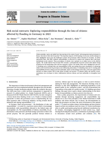 Ommer, J., Blackburn, S. orcid id iconORCID: https://orcid.org/0000-0003-1959-5465, Kalas, M., Neumann, J. orcid id iconORCID: https://orcid.org/0000-0003-3244-2578 and Cloke, H. L. orcid id iconORCID: https://orcid.org/0000-0002-1472-868X (2024) Risk social contracts: exploring responsibilities through the lens of citizens affected by flooding in Germany in 2021. Progress in Disaster Science, 21. 100315. ISSN 2590-0617 doi: 10.1016/j.pdisas.2024.100315