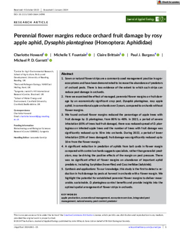 Sown or natural flower strips are a commonly used management practice in agroecosystems and have been demonstrated to increase the abundance of predators of orchard pests. There is less evidence of the extent to which such strips can reduce pest damage in orchards. Here we examined the effect of managed, perennial flower margins on fruit damage by an economically significant crop pest, Dysaphis plantaginea, rosy apple aphid, in conventional apple orchards over 2 years, compared to orchards without flower margins. We found orchard flower margins reduced the percentage of apple trees with fruit damage by D. plantaginea, from 80% to 48%. In 2021, a period of severe infestation (65% of trees had fruit damage), there was reduced spread of D. plantaginea on infested apple trees and the number of trees with fruit damage was significantly reduced up to 50 m into orchards. During 2022, a period of lower infestation (25% of trees damaged), fruit damage was significantly reduced up to 10 m from the flower margin. A significant reduction in predation of aphids from bait cards in flower margin compared with control orchards suggests specialists, rather than generalist predators, may be driving the positive effects of the margin on pest pressure. There was no significant effect of flower margins on abundance of important aphid predators, including Syrphidae (hoverflies) and Coccinellidae (ladybirds). Synthesis and applications: To our knowledge, this study is the first to detect a reduction in fruit damage by pests at harvest in orchards with a flower margin. We highlight the potential for established perennial flower margins to deliver measurable, sustainable, D. plantaginea control benefits and provide insights into the optimal spatial arrangement of flower strips in orchards.