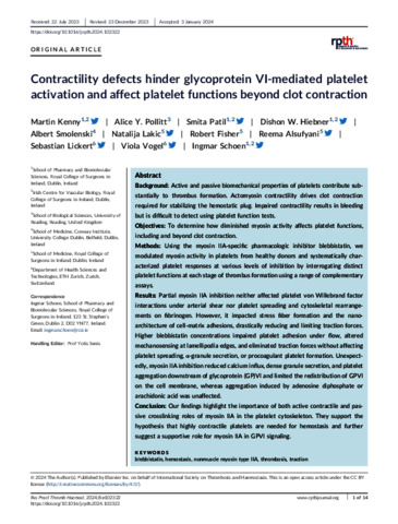 Kenny, M., Pollitt, A. Y. orcid id iconORCID: https://orcid.org/0000-0001-8706-5154, Patil, S., Hiebner, D. W., Smolenski, A., Lakic, N., Fisher, R., Alsufyani, R., Lickert, S., Vogel, V. and Schoen, I. (2024) Contractility defects hinder glycoprotein VI-mediated platelet activation and affect platelet functions beyond clot contraction. Research and Practice in Thrombosis and Haemostasis, 8 (1). 102322. ISSN 2475-0379 doi: 10.1016/j.rpth.2024.102322