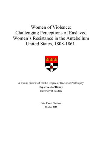 Shearer, E. F. (2024) Women of violence: challenging perceptions of enslaved women’s resistance in the antebellum United States, 1808-1861. PhD thesis, University of Reading. doi: 10.48683/1926.00115296