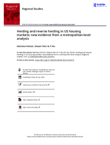Pollock, M., Masaki, M. and Wu, Y. orcid id iconORCID: https://orcid.org/0000-0003-0354-5658 (2024) Herding and reverse herding in US housing markets: new evidence from a metropolitan-level analysis. Regional Studies. ISSN 1360-0591 doi: 10.1080/00343404.2024.2325613