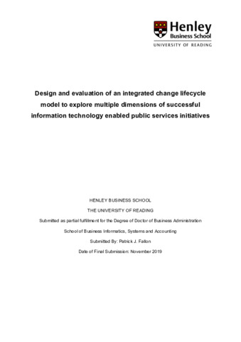Fallon, P. J. (2020) Design and evaluation of an integrated change lifecycle model to explore multiple dimensions of successful information technology enabled public services initiatives. DBA thesis, University of Reading. doi: 10.48683/1926.00115582
