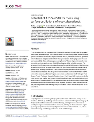 Ledger, M. J. orcid id iconORCID: https://orcid.org/0000-0001-5279-0858, Sowter, A., Morrison, K. orcid id iconORCID: https://orcid.org/0000-0002-8075-0316, Evans, C. D., Large, D. J., Athab, A., Gee, D., Brown, C. and Sjögersten, S. (2024) Potential of APSIS-InSAR for measuring surface oscillations of tropical peatlands. PLoS ONE, 19 (2). e0298939. ISSN 1932-6203 doi: 10.1371/journal.pone.0298939