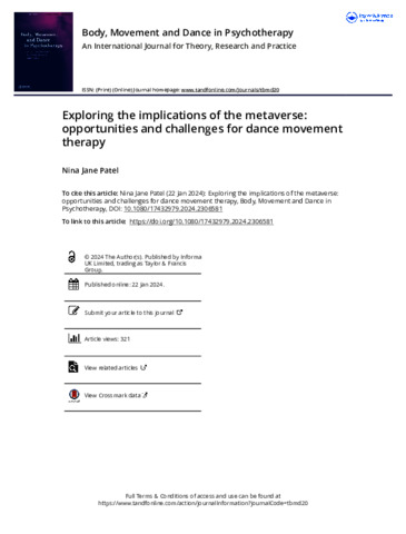 Patel, N. J. (2024) Exploring the implications of the metaverse: opportunities and challenges for dance movement therapy. Body, Movement and Dance in Psychotherapy. ISSN 1743-297 doi: 10.1080/17432979.2024.2306581
