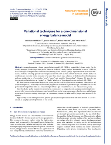 Del Sarto, G. orcid id iconORCID: https://orcid.org/0009-0006-3257-6903, Bröcker, J. orcid id iconORCID: https://orcid.org/0000-0002-0864-6530, Flandoli, F. orcid id iconORCID: https://orcid.org/0000-0003-2837-3784 and Kuna, T. (2024) Variational techniques for a one-dimensional energy balance model. Nonlinear Processes in Geophysics, 31 (1). pp. 137-150. ISSN 1607-7946 doi: 10.5194/npg-31-137-2024