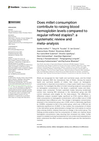 Does millet consumption contribute to raising blood hemoglobin levels compared to regular refined staples?: a systematic review and meta-analysis.