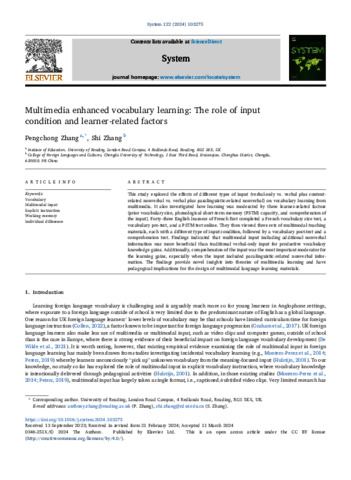 Zhang, P. orcid id iconORCID: https://orcid.org/0000-0002-2136-4984 and Zhang, S. (2024) Multimedia enhanced vocabulary learning: the role of input condition and learner-related factors. System, 122. 103275. ISSN 1879-3282 doi: 10.1016/j.system.2024.103275