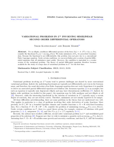 Katzourakis, N. and Moser, R. (2023) Variational problems in L∞ involving semilinear second order differential operators. ESAIM Control Optimization & Calculus of Variations, 29. 76. ISSN 1262-3377 doi: 10.1051/cocv/2023066