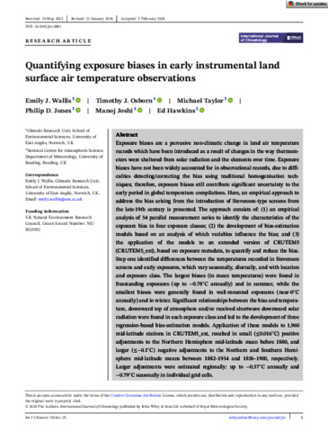 Wallis, E. J. orcid id iconORCID: https://orcid.org/0000-0002-2475-0899, Osborn, T. J. orcid id iconORCID: https://orcid.org/0000-0001-8425-6799, Taylor, M. orcid id iconORCID: https://orcid.org/0000-0002-3473-3478, Jones, P. D. orcid id iconORCID: https://orcid.org/0000-0001-5032-5493, Joshi, M. orcid id iconORCID: https://orcid.org/0000-0002-2948-2811 and Hawkins, E. orcid id iconORCID: https://orcid.org/0000-0001-9477-3677 (2024) Quantifying exposure biases in early instrumental land surface air temperature observations. International Journal of Climatology. ISSN 1097-0088 doi: 10.1002/joc.8401