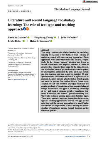 This study considers the relative benefits for vocabulary learning of exposure to two types of texts, literary or non-literary, used with two teaching approaches. These approaches were termed functional and creative respectively. In the former, learners’ attention was drawn to factual information and linguistic features in order to develop their linguistic knowledge. In the latter, the aim was to stimulate learners’ personal and emotional response, by drawing their attention to the text’s emotional content and how language was used to express meaning. We analysed data from 160 learners of French in eight schools in England. Learners in four schools studied French poems and those in another four studied French factual texts. Teachers in each text condition employed functional and creative methods of exploitation within a counterbalanced design. We assessed two types of vocabulary knowledge at pre- and post-test: meaning-recall of vocabulary contained in the texts, and learners’ general vocabulary size. Our results indicated learning gains across both text-types. There were however important interactions between text-type and teaching approach and between text-type and the order in which the teaching approaches were used. Finally, we consider the implications of these findings for understanding of vocabulary learning through literature and for classroom practice.