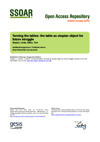 Stupart, L. and Dillon, T. (2019) Turning the tables: the table as utopian object for future struggle. Studies in Arts and Humanities, 5 (1). pp. 24-39. ISSN 2009-8278 doi: 10.18193/sah.v5i1.168