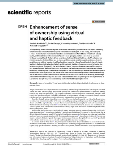 Enhancement of sense of ownership using virtual and haptic feedback.
