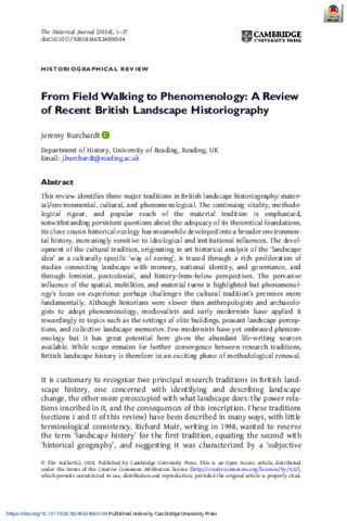 This review identifies three major traditions in British landscape historiography: material/environmental, cultural, and phenomenological. The continuing vitality, methodological rigour, and popular reach of the material tradition is emphasized, notwithstanding persistent questions about the adequacy of its theoretical foundations. Its close cousin historical ecology has meanwhile developed into a broader environmental history, increasingly sensitive to ideological and institutional influences. The development of the cultural tradition, originating in art historical analysis of the ‘landscape idea’ as a culturally specific ‘way of seeing’, is traced through a rich proliferation of studies connecting landscape with memory, national identity, and governance, and through feminist, postcolonial, and history-from-below perspectives. The pervasive influence of the spatial, mobilities, and material turns is highlighted but phenomenology’s focus on experience perhaps challenges the cultural tradition’s premises more fundamentally. Although historians were slower than anthropologists and archaeologists to adopt phenomenology, medievalists and early modernists have applied it rewardingly to topics such as the settings of elite buildings, peasant landscape perceptions, and collective landscape memories. Few modernists have yet embraced phenomenology but it has great potential here given the abundant life-writing sources available. While scope remains for further convergence between research traditions, British landscape history is therefore in an exciting phase of methodological renewal.