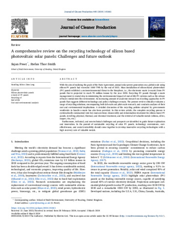 Preet, S. orcid id iconORCID: https://orcid.org/0009-0006-1192-5094 and Smith, S. T. orcid id iconORCID: https://orcid.org/0000-0002-5053-4639 (2024) A comprehensive review on the recycling technology of silicon based photovoltaic solar panels: challenges and future outlook. Journal of Cleaner Production, 448. 141661. ISSN 0959-6526 doi: 10.1016/j.jclepro.2024.141661
