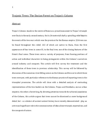 Trajan's Column stands in the centre of Rome as a proud monument to Trajan's triumph over Dacia in the early second century. On its 29 m tall shaft, a helical frieze depicts the events of the two wars which won the province for the Roman Empire. There are 224 trees to be found throughout this relief, 222 of which are native to Dacia. These trees have traditionally been treated as scene dividers and background material to the column's action. This article, which begins by exploring the identification of the trees in previous scholarship, argues that they are in fact crucial to the column's narrative of industry and conquest. The discussion of identification is followed by an examination of the numerous tree-felling scenes on the column as a metaphor for conquest. The article closes with a detailed analysis of contrasting representations of the two leaders on the column, Trajan and Decebalus, one an urban emperor, the other a forest king. By directing attention towards the arboreal population of the column, this article argues that trees cannot be dismissed as mere background detail, but play an active and significant role in the communication of ideas about triumph, imperialism and the conquest of nature.