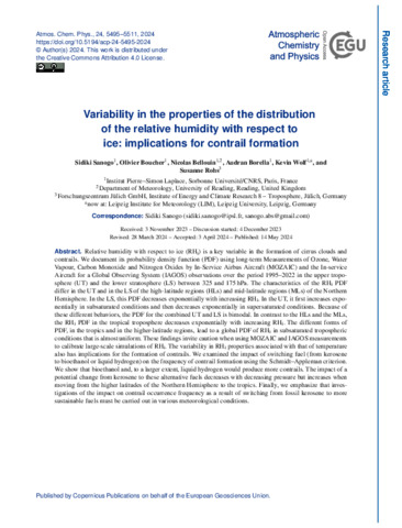 Sanogo, S., Boucher, O., Bellouin, N. orcid id iconORCID: https://orcid.org/0000-0003-2109-9559, Borella, A., Wolf, K. and Rohs, S. (2024) Variability in the properties of the distribution of the relative humidity with respect to ice: implications for contrail formation. Atmospheric Chemistry and Physics, 24 (9). pp. 5495-5511. ISSN 1680-7316 doi: 10.5194/acp-24-5495-2024