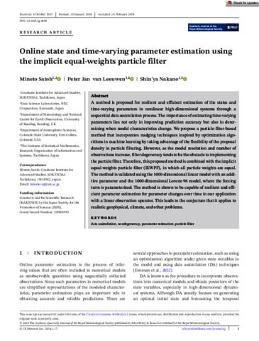 Satoh, M. orcid id iconORCID: https://orcid.org/0000-0002-2312-0051, Van Leeuwen, P. J. orcid id iconORCID: https://orcid.org/0000-0003-2325-5340 and Nakano, S.'y. orcid id iconORCID: https://orcid.org/0000-0003-0772-4610 (2024) Online state and time‐varying parameter estimation using the implicit equal‐weights particle filter. Quarterly Journal of the Royal Meteorological Society. ISSN 1477-870X doi: 10.1002/qj.4698