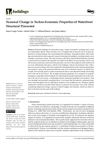 Historical buildings are constructed using a variety of materials, including stone, wood, and combinations thereof. These structures serve as tangible links to the past and are of great importance to cultural heritage, thus necessitating their protection. Throughout history, these buildings and materials have been exposed to various environmental conditions, including climate, wind, humidity, and seismic activity. This study focused on the Florya Atatürk Marine Mansion, Istanbul, a coastal structure situated at the shoreline and subject to the effects of wind, moisture, and sea salt. The mansion is primarily constructed from pinewood, and due to the complexity of the material salt can cause deterioration that poses a threat to the building’s cultural and historical value. With a focus on seasonal variations, this study explored the relationship between the mechanical properties and monetary values of the pinewood materials used in the waterfront mansion. To achieve this, samples were naturally aged in a saline environment by the sea and subjected to tensile and bending tests at the end of each season. The resulting mechanical properties were compared to computer simulations using finite element methods. By subtracting the specific depreciation rate of the material at the end of each season, a relationship between mechanical properties and monetary value was calculated and presented in graphical form. It was found that the material’s mechanical properties varied throughout the year, affecting its monetary value in different ways. Therefore, optimal maintenance should be provided before January to preserve the economic value of the material, considering temperature change, exposure to direct sunlight, and humidity, which have direct effects on the front and back parts of the building.