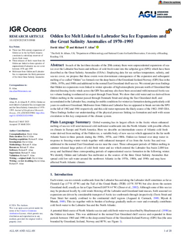 Odden ice melt linked to Labrador Sea ice expansions and the Great Salinity Anomalies of 1970–1995.