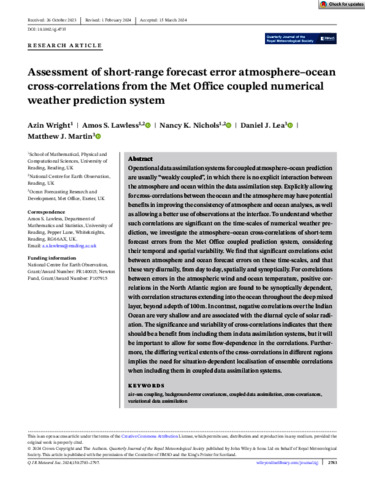 Wright, A., Lawless, A. S. orcid id iconORCID: https://orcid.org/0000-0002-3016-6568, Nichols, N. K. orcid id iconORCID: https://orcid.org/0000-0003-1133-5220, Lea, D. J. and Martin, M. J. (2024) Assessment of short-range forecast error atmosphere-ocean cross-correlations from the Met Office coupled numerical weather prediction system. Quarterly Journal of the Royal Meteorological Society, 150 (762). pp. 2783-2797. ISSN 1477-870X doi: 10.1002/qj.4735