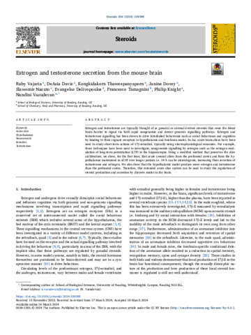 Vajaria, R., Davis, D., Thaweepanyaporn, K., Dovey, J., Nasuto, S. orcid id iconORCID: https://orcid.org/0000-0001-9414-9049, Delivopoulos, E. orcid id iconORCID: https://orcid.org/0000-0001-6156-1133, Tamagnini, F. orcid id iconORCID: https://orcid.org/0000-0002-8741-5094, Knight, P. orcid id iconORCID: https://orcid.org/0000-0003-0300-1554 and Vasudevan, N. orcid id iconORCID: https://orcid.org/0000-0003-4326-3938 (2024) Estrogen and testosterone secretion from the mouse brain. Steroids, 204. 109398. ISSN 1878-5867 doi: 10.1016/j.steroids.2024.109398