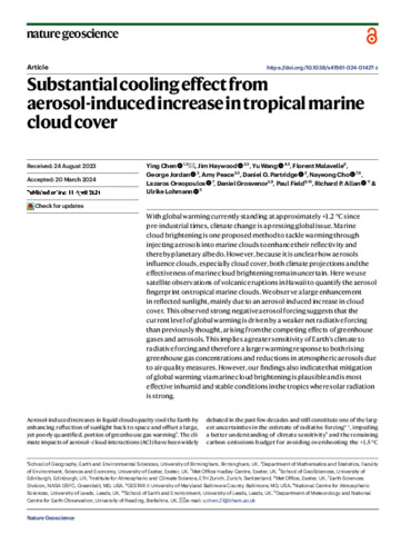 Substantial cooling effect from aerosol-induced increase in tropical marine cloud cover.