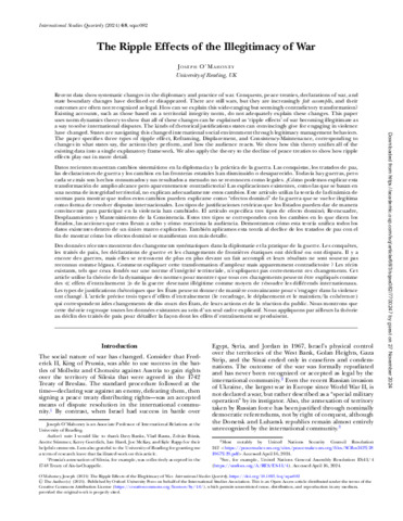Recent data show systematic changes in the diplomacy and practice of war. Conquests, peace treaties, declarations of war, and state boundary changes have declined or disappeared. There are still wars, but they are increasingly fait accomplis, and their outcomes are often not recognized as legal. How can we explain this wide-ranging but seemingly contradictory transformation? Existing accounts, such as those based on a territorial integrity norm, do not adequately explain these changes. This paper uses norm dynamics theory to show that all of these changes can be explained as ‘ripple effects’ of war becoming illegitimate as a way to solve international disputes. The kinds of rhetorical justifications states can convincingly give for engaging in violence have changed. States are navigating this changed international social environment through legitimacy management behaviors. The paper specifies three types of ripple effect, Reframing, Displacement, and Consistency-Maintenance, corresponding to changes in what states say, the actions they perform, and how the audience reacts. We show how this theory unifies all of the existing data into a single explanatory framework. We also apply the theory to the decline of peace treaties to show how ripple effects play out in more detail.