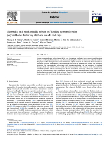 Tareq, A. Z., Hyder, M., Hermida Merino, D., Chippindale, A. M. orcid id iconORCID: https://orcid.org/0000-0002-5918-8701, Kaur, A., Cooper, J. A. orcid id iconORCID: https://orcid.org/0000-0002-3981-9246 and Hayes, W. orcid id iconORCID: https://orcid.org/0000-0003-0047-2991 (2024) Thermally and mechanically robust self-healing supramolecular polyurethanes featuring aliphatic amide end caps. Polymer, 302. 127052. ISSN 1873-2291 doi: 10.1016/j.polymer.2024.127052