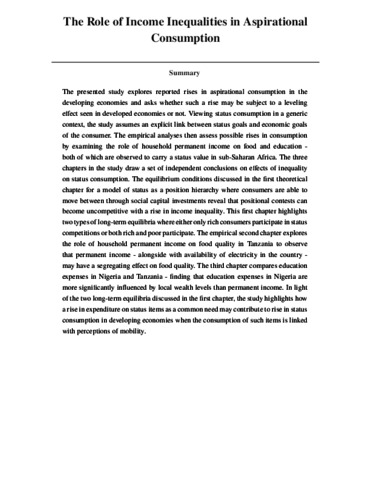 The presented study explores reported rises in aspirational consumption in the developing economies and asks whether such a rise may be subject to a leveling effect seen in developed economies or not. Viewing status consumption in a generic context, the study assumes an explicit link between status goals and economic goals of the consumer. The empirical analyses then assess possible rises in consumption by examining the role of household permanent income on food and education - both of which are observed to carry a status value in sub-Saharan Africa. The three chapters in the study draw a set of independent conclusions on effects of inequality on status consumption. The equilibrium conditions discussed in the first theoretical chapter for a model of status as a position hierarchy where consumers are able to move between through social capital investments reveal that positional contests can become uncompetitive with a rise in income inequality. This first chapter highlights two types of long-term equilibria where either only rich consumers participate in status competitions or both rich and poor participate. The empirical second chapter explores the role of household permanent income on food quality in Tanzania to observe that permanent income - alongside with availability of electricity in the country - may have a segregating effect on food quality. The third chapter compares education expenses in Nigeria and Tanzania - finding that education expenses in Nigeria are more significantly influenced by local wealth levels than permanent income. In light of the two long-term equilibria discussed in the first chapter, the study highlights how a rise in expenditure on status items as a common need may contribute to rise in status consumption in developing economies when the consumption of such items is linked with perceptions of mobility.