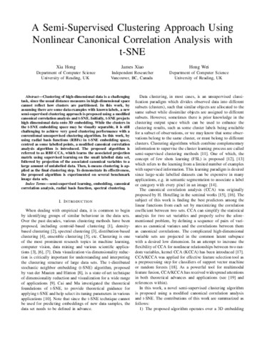 Hong, X. orcid id iconORCID: https://orcid.org/0000-0002-6832-2298, Xiao, J. and Wei, H. orcid id iconORCID: https://orcid.org/0000-0002-9664-5748 (2024) A semi-supervised clustering approach using nonlinear canonical correlation analysis with t-SNE. In: 2024 International Joint Conference on Neural Networks (IJCNN), 30 Jun- 5 Jul 2024, Yokohoma, Japan. doi: 10.1109/ijcnn60899.2024.10650841