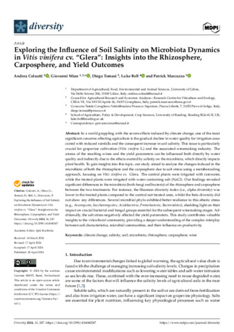 In a world grappling with the severe effects induced by climate change, one of the most significant concerns affecting agriculture is the gradual decline in water quality for irrigation associated to reduced rainfalls, and the consequent increase in soil salinity. This issue is particularly crucial for grapevine cultivation (Vitis vinifera L.) and the associated winemaking industry. The aroma of resulting wines and yield parameters can be influenced both directly by water quality and indirectly due to the effects exerted by salinity on the microbiota, which directly impacts plant health. To gain insights into this topic, our study aimed to analyse the changes induced in the microbiota of both the rhizosphere and carposphere due to salt stress using a metabarcoding approach, focusing on Vitis vinifera cv. Glera. Control plants were irrigated with rainwater, while treated plants were irrigated with water containing salt (NaCl). Our findings revealed significant differences in the microbiota (both fungi and bacteria) of the rhizosphere and carposphere between the two treatments. For instance, the Shannon diversity index (i.e., alfa-diversity) was lower in the treated plants compared to the control not-treated, whilst the beta-diversity did not show any differences. Several microbial phyla exhibited better resilience to this abiotic stress (e.g., Ascomycota, Saccharomycetes, Acidobacteria, Proteobacteria, Bacteroidetes), shedding light on their impact on crucial bacterial and fungal groups essential for subsequent winemaking stages. Additionally, the salt stress negatively affected yield parameters. This study contributes valuable insights to the viticultural community, providing a deeper understanding of the complex interplay between soil characteristics, microbial communities, and their influence on productivity.