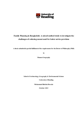 Hossain, M. B. (2024) Family planning in Bangladesh: a mixed method study to investigate the challenges of reducing unmet need for better service provision. PhD thesis, University of Reading. doi: 10.48683/1926.00116089