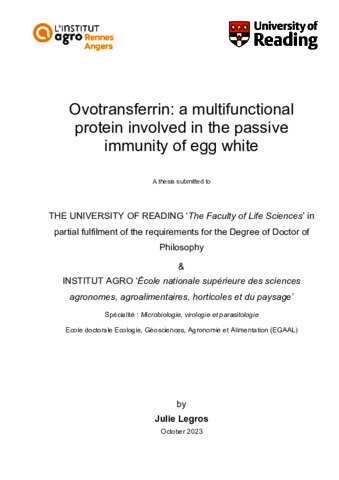 Legros, J. (2024) Ovotransferrin: a multifunctional protein involved in the passive immunity of egg white. PhD thesis, University of Reading. doi: 10.48683/1926.00116091