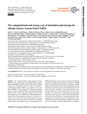 Acosta, M. C. orcid id iconORCID: https://orcid.org/0000-0001-7054-8168, Palomas, S. orcid id iconORCID: https://orcid.org/0000-0002-2191-152X, Paronuzzi Ticco, S. V., Utrera, G., Biercamp, J. orcid id iconORCID: https://orcid.org/0000-0002-6677-2164, Bretonniere, P.-A. orcid id iconORCID: https://orcid.org/0000-0002-3066-6685, Budich, R. orcid id iconORCID: https://orcid.org/0000-0002-9274-4052, Castrillo, M. orcid id iconORCID: https://orcid.org/0000-0003-1826-623X, Caubel, A., Doblas-Reyes, F. orcid id iconORCID: https://orcid.org/0000-0002-6622-4280, Epicoco, I., Fladrich, U., Joussaume, S., Kumar Gupta, A., Lawrence, B. orcid id iconORCID: https://orcid.org/0000-0001-9262-7860, Le Sager, P., Lister, G., Moine, M.-P., Rioual, J.-C., Valcke, S. orcid id iconORCID: https://orcid.org/0000-0002-0438-5978, Zadeh, N. and Balaji, V. orcid id iconORCID: https://orcid.org/0000-0001-7561-5438 (2024) The computational and energy cost of simulation and storage for climate science: lessons from CMIP6. Geoscientific Model Development, 17 (8). pp. 3081-3098. ISSN 1991-9603 doi: 10.5194/gmd-17-3081-2024