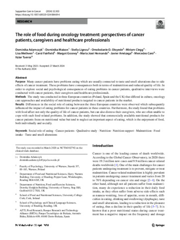 Adamczyk, D., Maison, D., Lignou, S. orcid id iconORCID: https://orcid.org/0000-0001-6971-2258, Oloyede, O., O., Clegg, M., Methven, L. orcid id iconORCID: https://orcid.org/0000-0002-7636-6872, Fairfield, C., Gosney, M., Hernando, M. J., Amézaga, J., Caro, M. and Tueros, I. (2024) The role of food during oncology treatment: perspectives of cancer patients, caregivers and healthcare professionals. Supportive Care in Cancer, 32 (5). 303. ISSN 1433-7339 doi: 10.1007/s00520-024-08469-4
