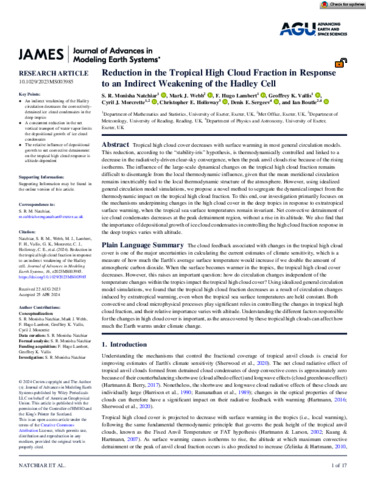 Natchiar, S. R. M., Webb, M. J., Lambert, F. H., Vallis, G. K., Morcrette, C. J., Holloway, C. E. orcid id iconORCID: https://orcid.org/0000-0001-9903-8989, Sergeev, D. E. and Boutle, I. (2024) Reduction in the tropical high cloud fraction in response to an indirect weakening of the Hadley cell. Journal of Advances in Modeling Earth Systems, 16 (5). e2023MS003985. ISSN 1942-2466 doi: 10.1029/2023MS003985