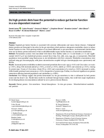 James, D., Poveda, C., Walton, G. E. orcid id iconORCID: https://orcid.org/0000-0001-5426-5635, Elmore, J. S. orcid id iconORCID: https://orcid.org/0000-0002-2685-1773, Linden, B., Gibson, J., Griffin, B. A., Robertson, M. D. and Lewis, M. C. (2024) Do high-protein diets have the potential to reduce gut barrier function in a sex-dependent manner? European Journal of Nutrition, 63 (6). pp. 2035-2054. ISSN 1436-6215 doi: 10.1007/s00394-024-03407-w