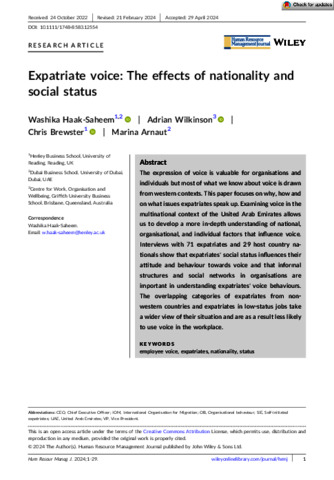 The expression of voice is valuable for organizations and individuals but most of what we know about voice is drawn from western contexts. This paper focuses on why, how and on what issues expatriates speak up. Examining voice in the multinational context of the United Arab Emirates allows us to develop a more in-depth understanding of national, organizational, and individual factors that influence voice. Interviews with 71 expatriates and 29 host country nationals show that expatriates’ social status influences their attitude and behaviour towards voice and that informal structures and social networks in organizations are important in understanding expatriates’ voice behaviours. The overlapping categories of expatriates from non-western countries and expatriates in low-status jobs take a wider view of their situation and are as a result less likely to use voice in the workplace.
