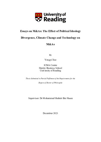 Xue, Y. (2024) Essays on M&As: the effect of political ideology divergence, climate change and technology on M&As. PhD thesis, University of Reading. doi: 10.48683/1926.00116238