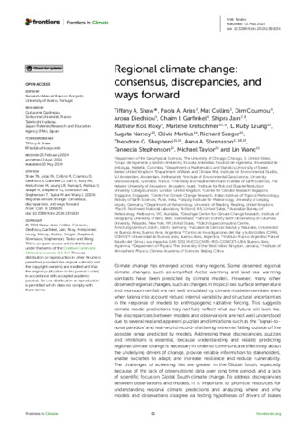 Shaw, T. A., Arias, P. A., Collins, M., Coumou, D., Diedhiou, A., Garfinkel, C. I., Jain, S., Roxy, M. K., Kretschmer, M. orcid id iconORCID: https://orcid.org/0000-0002-2756-9526, Leung, L. R., Narsey, S., Martius, O., Seager, R., Shepherd, T. G. orcid id iconORCID: https://orcid.org/0000-0002-6631-9968, Sörensson, A. A., Stephenson, T., Taylor, M. and Wang, L. (2024) Regional climate change: consensus, discrepancies, and ways forward. Frontiers in Climate, 6. 1391634. ISSN 2624-9553 doi: 10.3389/fclim.2024.1391634
