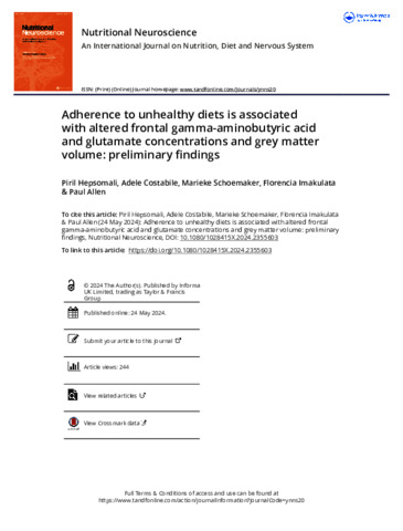 Hepsomali, P. orcid id iconORCID: https://orcid.org/0000-0001-5812-1081, Costabile, A., Schoemaker, M., Imakulata, F. and Allen, P. (2024) Adherence to unhealthy diets is associated with altered frontal gamma-aminobutyric acid and glutamate concentrations and grey matter volume: preliminary findings. Nutritional Neuroscience. ISSN 1476-8305 doi: 10.1080/1028415X.2024.2355603