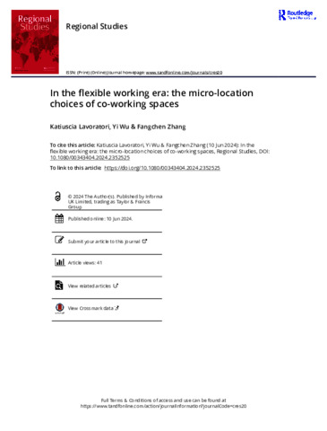 Lavoratori, K. orcid id iconORCID: https://orcid.org/0000-0002-0078-4525, Wu, Y. orcid id iconORCID: https://orcid.org/0000-0003-0354-5658 and Zhang, F. (2024) In the flexible working era: the micro-location choices of co-working spaces. Regional Studies. ISSN 1360-0591 doi: 10.1080/00343404.2024.2352525