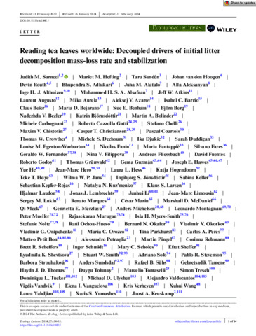Sarneel, J. M., Hefting, M. M., Sandén, T., van den Hoogen, J., Routh, D., Adhikari, B. S., Alatalo, J.M., Aleksanyan, A., Althuizen, I.H.J., Alsafran, M.H.S.A., Atkins, J.W., Augusto, L., Aurela, M., Azarov, A.V., Barrio, I.C., Beier, C., Bejarano, M.D., Benham, S.E., Berg, B., Bezler, N.V., Björnsdóttir, K., Bolinder, M.A., Carbognani, M., Cazzolla Gatti, R., Chelli, S., Chistotin, M.V., Christiansen, C.T., Courtois, P., Crowther, T.W., Dechoum, M.S., Djukic, I., Duddigan, S. orcid id iconORCID: https://orcid.org/0000-0002-6228-4462, Egerton-Warburton, L.M., Fanin, N., Fantappiè, M., Fares, S., Fernandes, G.W., Filippova, N.V., Fliessbach, A., Fuentes, D., Godoy, R., Grünwald, T., Guzmán, G., Hawes, J.E., He, Y., Hero, J.-M., Hess, L.L., Hogendoorn, K., Høye, T.T., Jans, W.W.P., Jónsdóttir, I.S., Keller, S., Kepfer-Rojas, S., Kuz'menko, N.N., Larsen, K.S., Laudon, H., Lembrechts, J.J., Li, J., Limousin, J.-M., Lukin, S.M., Marques, R., Marín, C., McDaniel, M.D., Meek, Q., Merzlaya, G.E., Michelsen, A., Montagnani, L., Mueller, P., Murugan, R., Myers-Smith, I.H., Nolte, S., Ochoa-Hueso, R., Okafor, B.N., Okorkov, V.V., Onipchenko, V.G., Orozco, M.C., Parkhurst, T., Peres, C.A., Petit Bon, M., Petraglia, A., Pingel, M., Rebmann, C., Scheffers, B.R., Schmidt, I., Scholes, M.C., Sheffer, E., Shevtsova, L.K., Smith, S.W., Sofo, A., Stevenson, P.R., Strouhalová, B., Sundsdal, A., Sühs, R.B., Tamene, G., Thomas, H.J.D., Tolunay, D., Tomaselli, M., Tresch, S., Tucker, T.L., Ulyshen, M.D., Valdecantos, A., Vandvik, V., Vanguelova, E.I., Verheyen, K., Wang, X., Yahdjian, L., Yumashev, X.S. and Keuskamp, J.A. (2024) Reading tea leaves worldwide: decoupled drivers of initial litter decomposition mass-loss rate and stabilisation. Ecology Letters, 27 (5). e14415. ISSN 1461-0248 doi: 10.1111/ele.14415