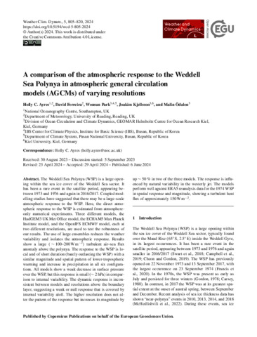 Ayres, H. C. orcid id iconORCID: https://orcid.org/0000-0003-0294-7620, Ferreira, D. orcid id iconORCID: https://orcid.org/0000-0003-3243-9774, Park, W., Kjellsson, J. and Ödalen, M. (2024) A comparison of the atmospheric response to the Weddell Sea Polynya in AGCMs of varying resolutions. Weather and Climate Dynamics, 5 (2). pp. 805-820. ISSN 2698-4016 doi: 10.5194/wcd-5-805-2024