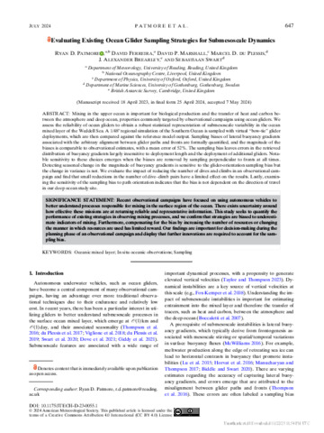 Patmore, R. D. orcid id iconORCID: https://orcid.org/0000-0002-5571-9229, Ferreira, D. orcid id iconORCID: https://orcid.org/0000-0003-3243-9774, Marshall, D. P., du Plessis, M. D., Brearley, J. A. and Swaart, S. (2024) Evaluating existing ocean glider sampling strategies for submesoscale dynamics. Journal of Atmospheric and Oceanic Technology, 41 (7). pp. 647-663. ISSN 1520-0426 doi: 10.1175/JTECH-D-23-0055.1