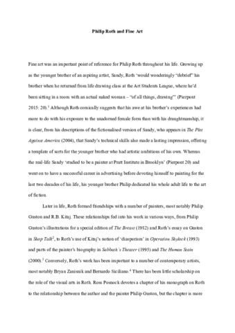 Brauner, D. orcid id iconORCID: https://orcid.org/0000-0003-2817-7847 (2024) Philip Roth and fine art. In: Pozorski, A. and Scheurer, M. (eds.) The Bloomsbury Handbook to Philip Roth. Bloomsbury, New York, pp. 113-124. ISBN 9781501380242 doi: 10.5040/9781501380273.ch-10
