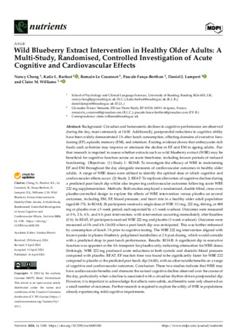 Background: Circadian and homeostatic declines in cognitive performance are observed during the day, most commonly at 14:00. Additionally, postprandial reductions in cognitive ability have been widely demonstrated 1 h after lunch consumption, affecting domains of executive functioning (EF), episodic memory (EM), and attention. Existing evidence shows that anthocyanin-rich foods such as berries may improve or attenuate the decline in EF and EM in ageing adults. Further research is required to assess whether extracts such as wild blueberry extract (WBE) may be beneficial for cognitive function across an acute timeframe, including known periods of reduced functioning. Objectives: (1) Study 1: ROAB: To investigate the efficacy of WBE in maintaining EF and EM throughout the day alongside measures of cardiovascular outcomes in healthy older adults. A range of WBE doses were utilised to identify the optimal dose at which cognitive and cardiovascular effects occur. (2) Study 2: BEAT: To replicate alleviation of cognitive decline during a predicted post-lunch dip whilst also improving cardiovascular outcomes following acute WBE 222 mg supplementation. Methods: Both studies employed a randomised, double-blind, cross-over, placebo-controlled design to explore the effects of WBE intervention versus placebo on several outcomes, including EM, EF, blood pressure, and heart rate in a healthy older adult population (aged 68–75). In ROAB, 28 participants received a single dose of WBE 111 mg, 222 mg, 444 mg, or 888 mg or placebo over a 5-week period, each separated by a 1-week washout. Outcomes were measured at 0 h, 2 h, 4 h, and 6 h post intervention, with intervention occurring immediately after baseline (0 h). In BEAT, 45 participants received WBE 222 mg and placebo (1-week washout). Outcomes were measured at 0 h and 6 h (14:00) when a post-lunch dip was anticipated. This was further enhanced by consumption of lunch 1 h prior to cognitive testing. The WBE 222 mg intervention aligned with known peaks in plasma blueberry polyphenol metabolites at 2 h post dosing, which would coincide with a predicted drop in post-lunch performance. Results: ROAB: A significant dip in executive function was apparent at the 4 h timepoint for placebo only, indicating attenuation for WBE doses. Strikingly, WBE 222 mg produced acute reductions in both systolic and diastolic blood pressure compared with placebo. BEAT: EF reaction time was found to be significantly faster for WBE 222 compared to placebo at the predicted post-lunch dip (14:00), with no other notable benefits on a range of cognitive and cardiovascular outcomes. Conclusion: These two studies indicate that WBE may have cardiovascular benefits and attenuate the natural cognitive decline observed over the course of the day, particularly when a decline is associated with a circadian rhythm-driven postprandial dip. However, it is important to acknowledge that effects were subtle, and benefits were only observed on a small number of outcomes. Further research is required to explore the utility of WBE in populations already experiencing mild cognitive impairments