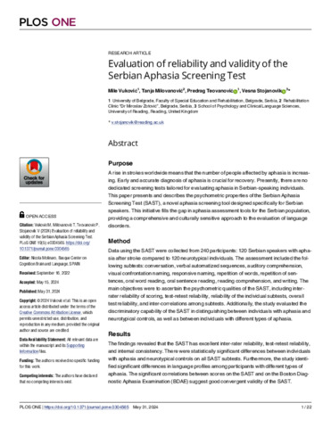 | Uncontrolled Keywords | Serbian Aphasia Screening Test (SAST), Psychometric properties, Aphasia assessment |